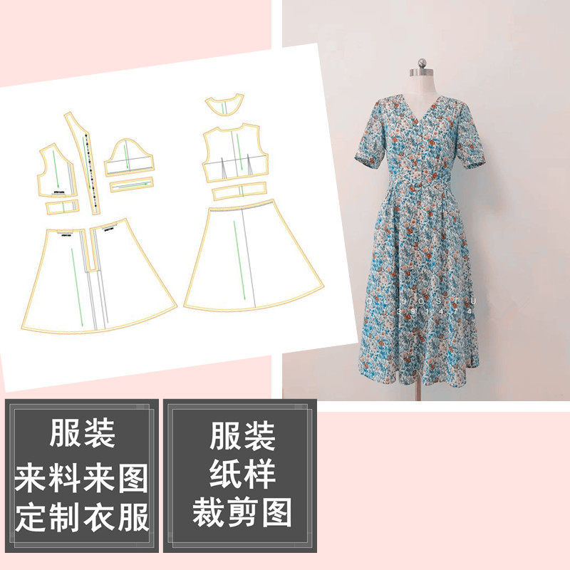 服装裁剪纸样图纸新女连衣裙样板裁剪图法式长裙大摆V领设计2090热门设计联盟服务商